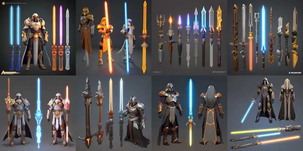 OK,按照以上原则,我们修改一下我们的提示词,看看生成了什么,的确加了 different types of 后,光剑就多了,问题解决了: