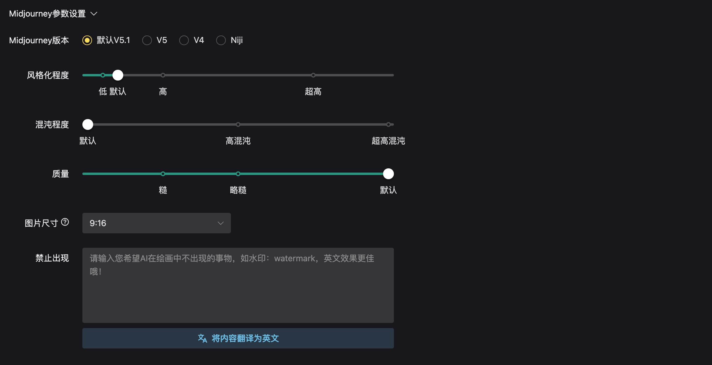 如果您使用本系统生图,建议您手动选择版本,在提示框中手动输入--v或--version参数将会失效;如果您只是为了更好的组合关键词,以复制到discord官方频道,则无此限制。